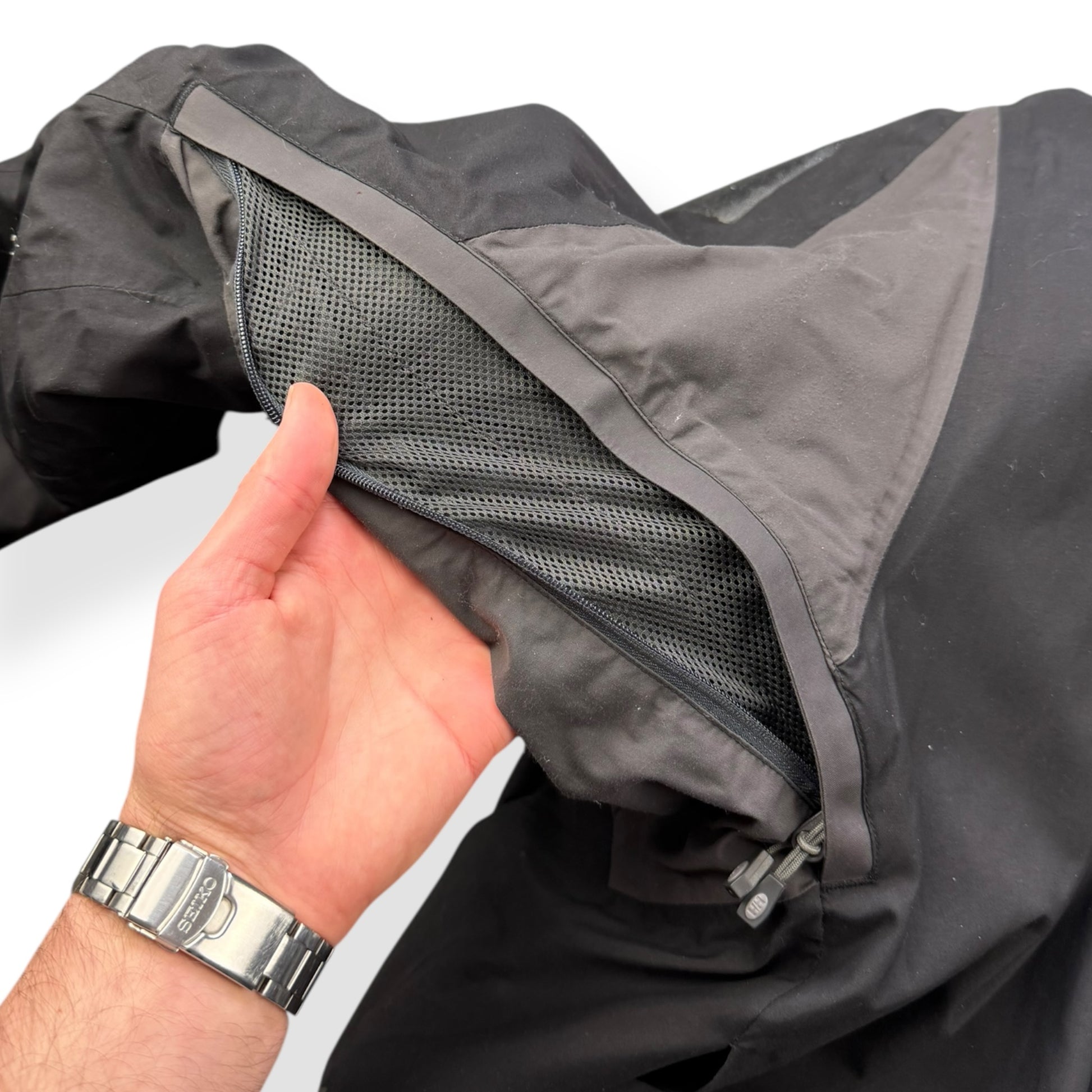 Black/Grey/White colourway. Fleece lined interior, multiple zipped pockets including stash chest pocket & ski pass pocket on the sleeve, elasticated hood & waist hem, underarm ventilation & interior mesh pockets for valuables with an audio port.