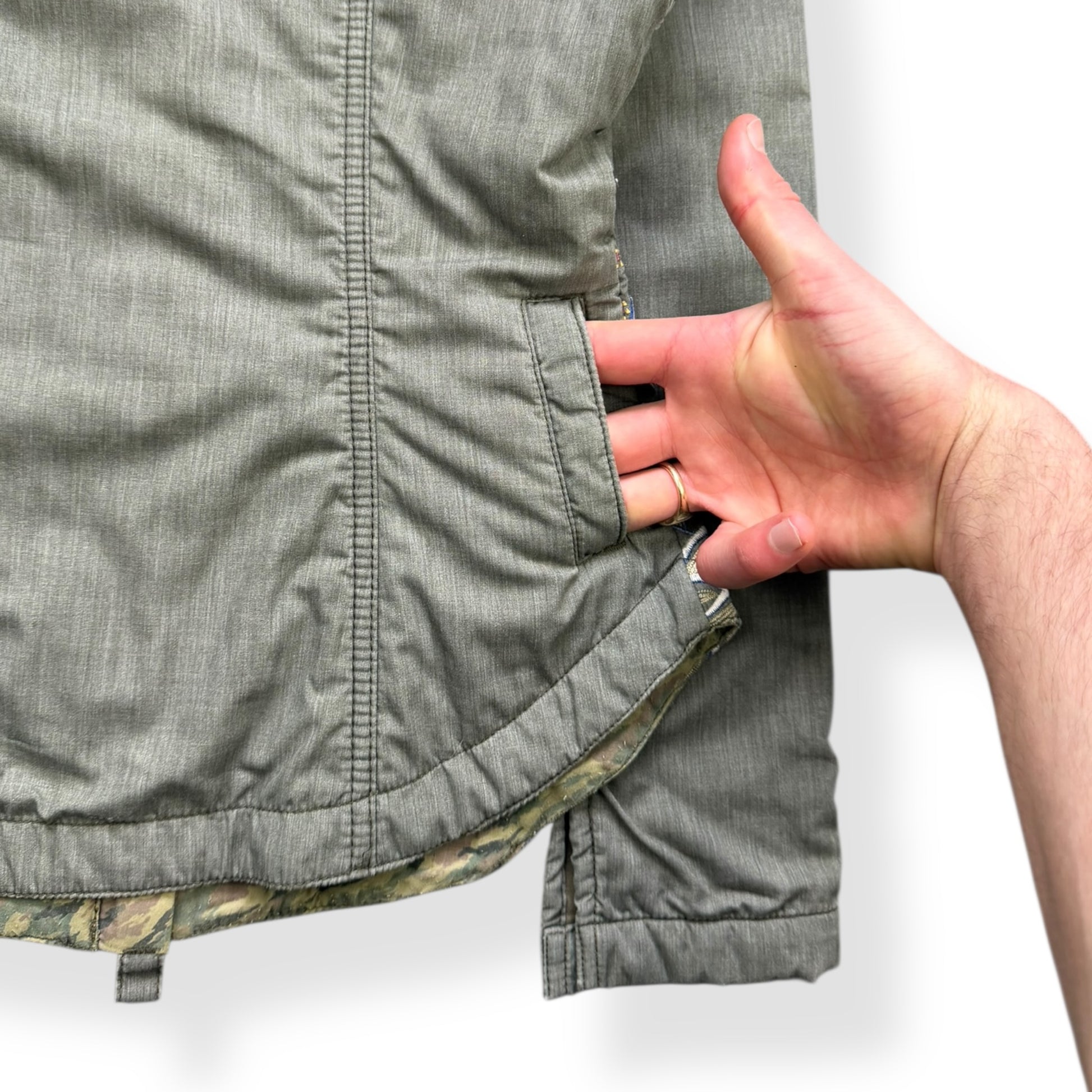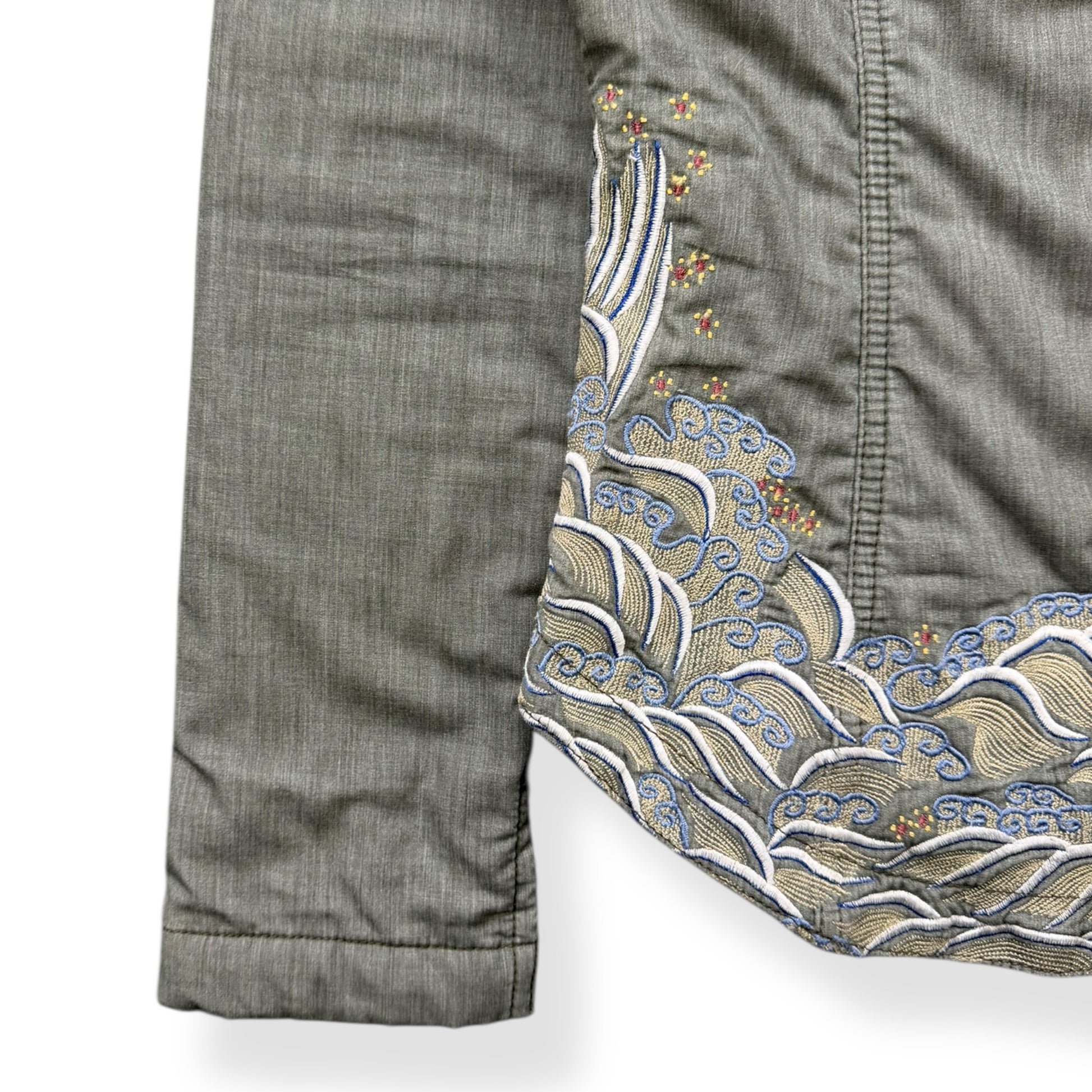 Khaki green colourway with detailed ocean wave embroidery around the hem. Collarless, tapered sides to fit tightly to the body, curved waist hem, signature two-tone zipper teeth, camo lining on the interior.