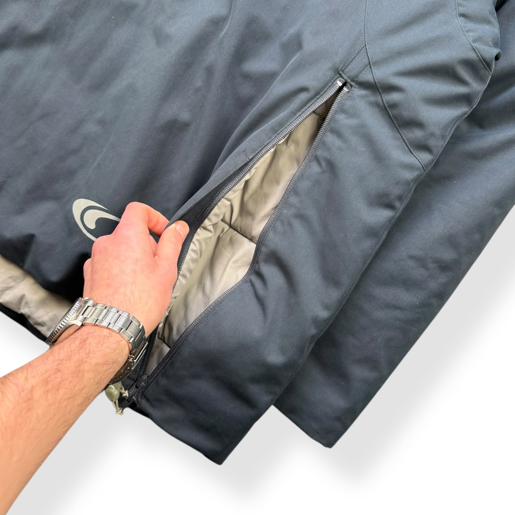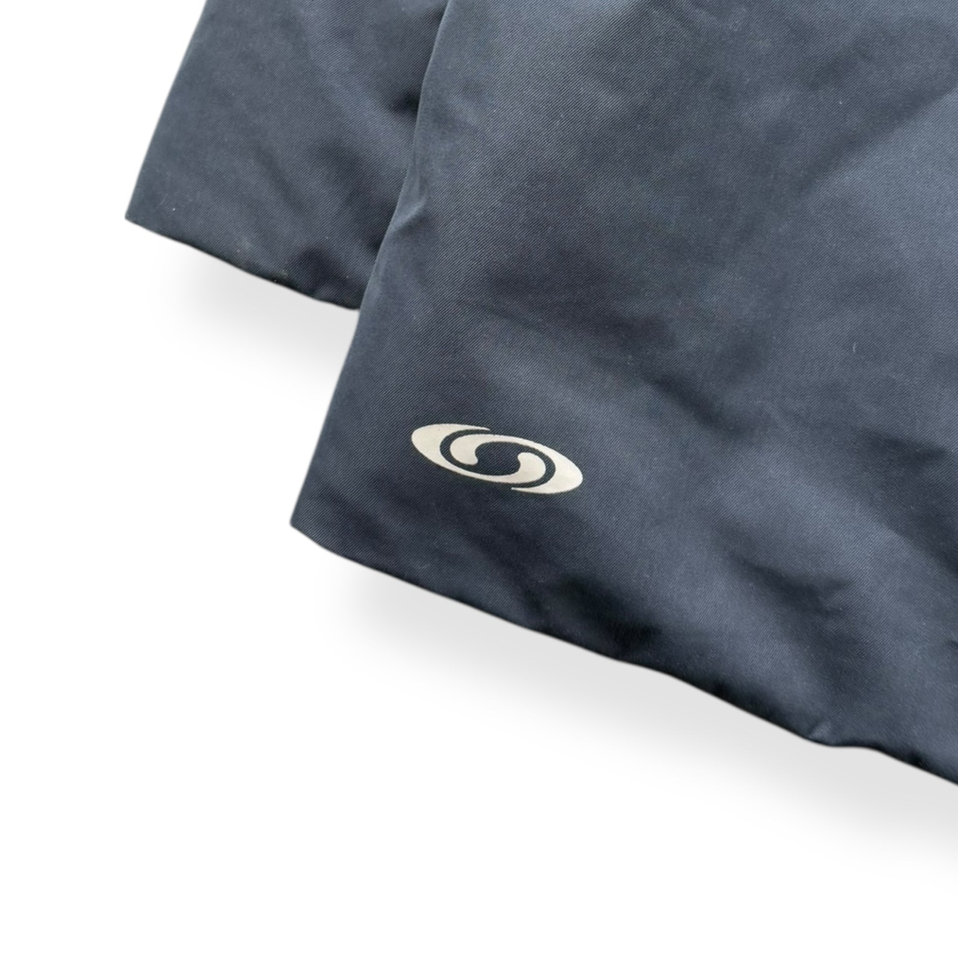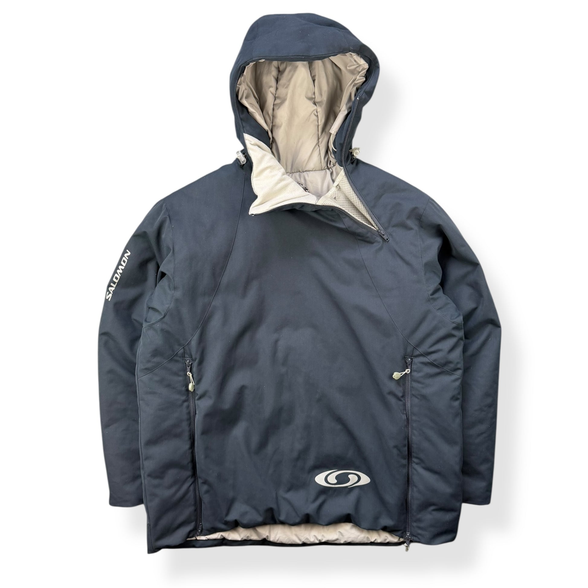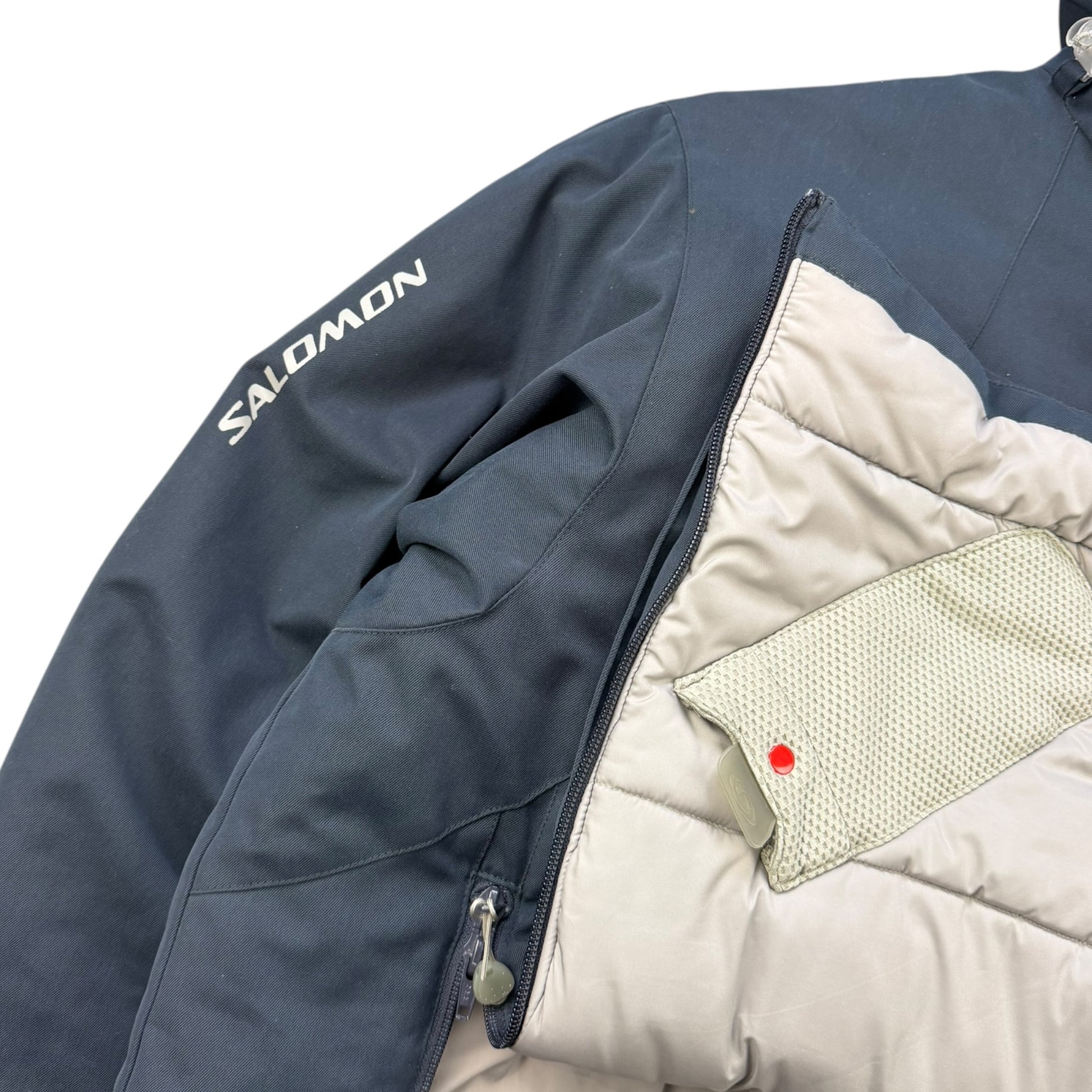 Navy Colourway. Asymmetric neck opening with a mesh neck guard, unique mesh storage compartments on the inside, elasticated hood & soft padded interior lining. Super high quality jacket, zip pulls are branded with the Salomon logo on one side & a finger print on the other.
