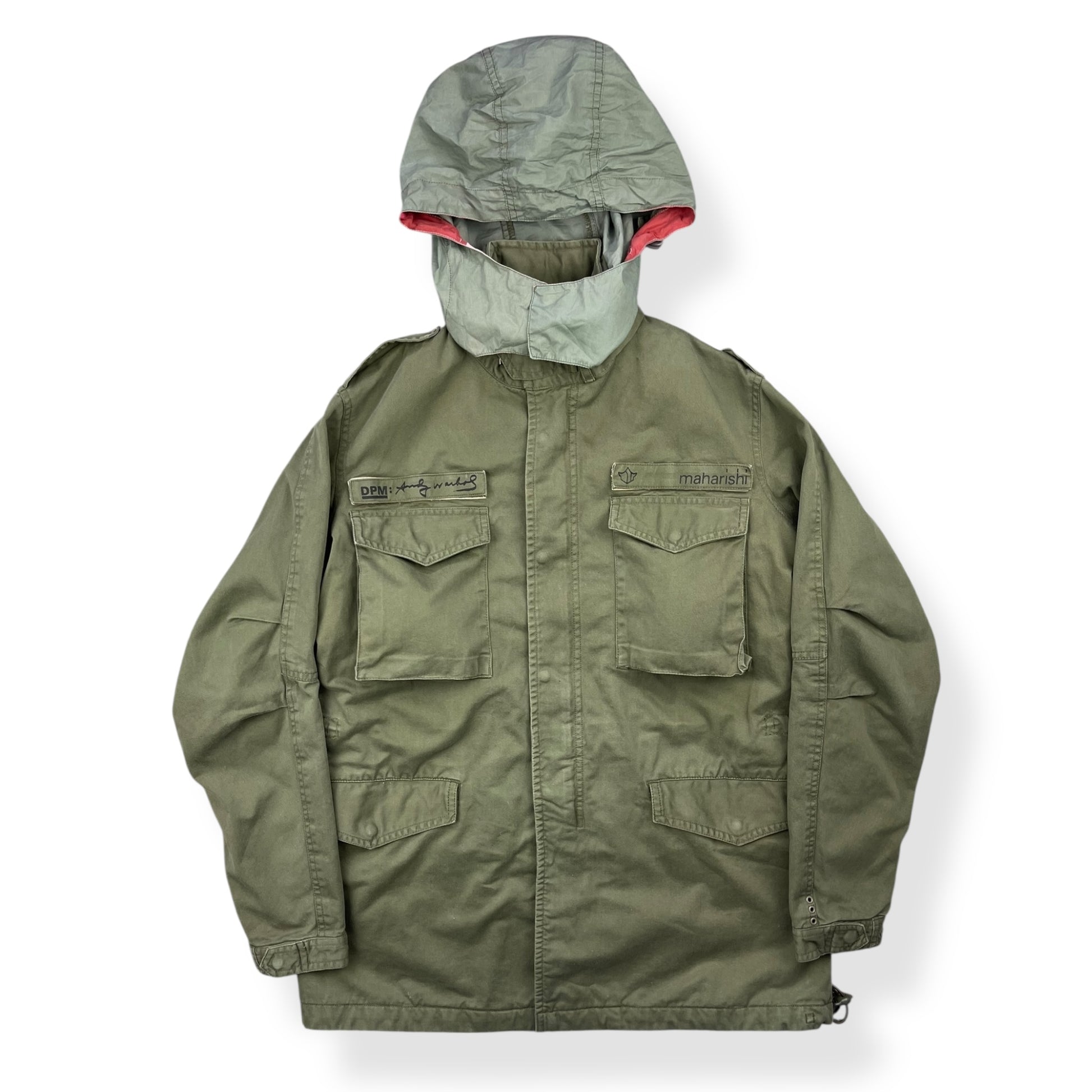 One of the early collaborations between Maharishi & Warhol. Green military jacket, 4 exterior pockets, lightweight packable hood, vibrant, abstract camo interior, baby pink main body zip, heavy duty metal riri zippers, elasticated waist hem & midriff.