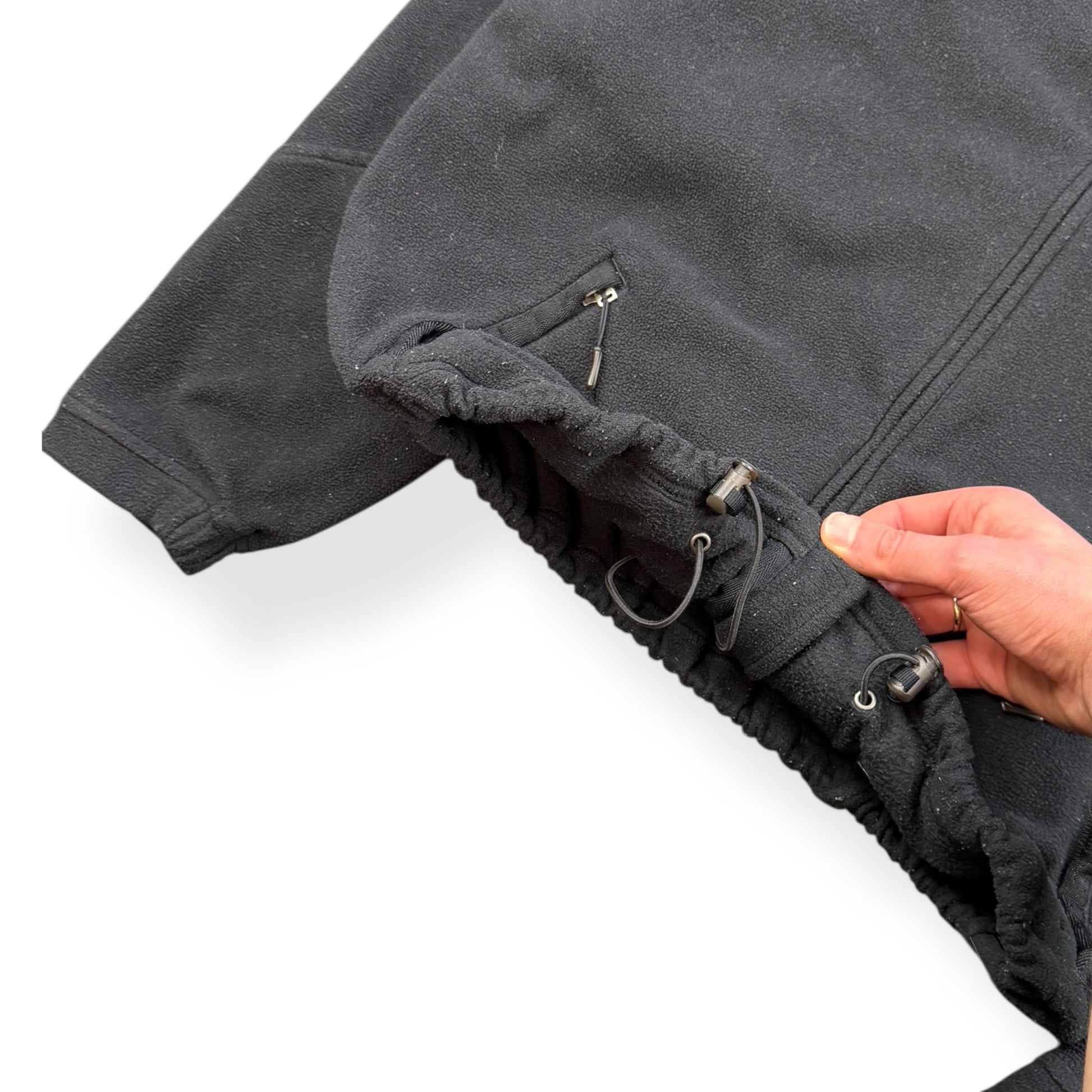 Black colourway. Hooded fleece jacket, drawstring adjustable hood, elasticated waist hem, embroidered logo on the cuff & back of neck
