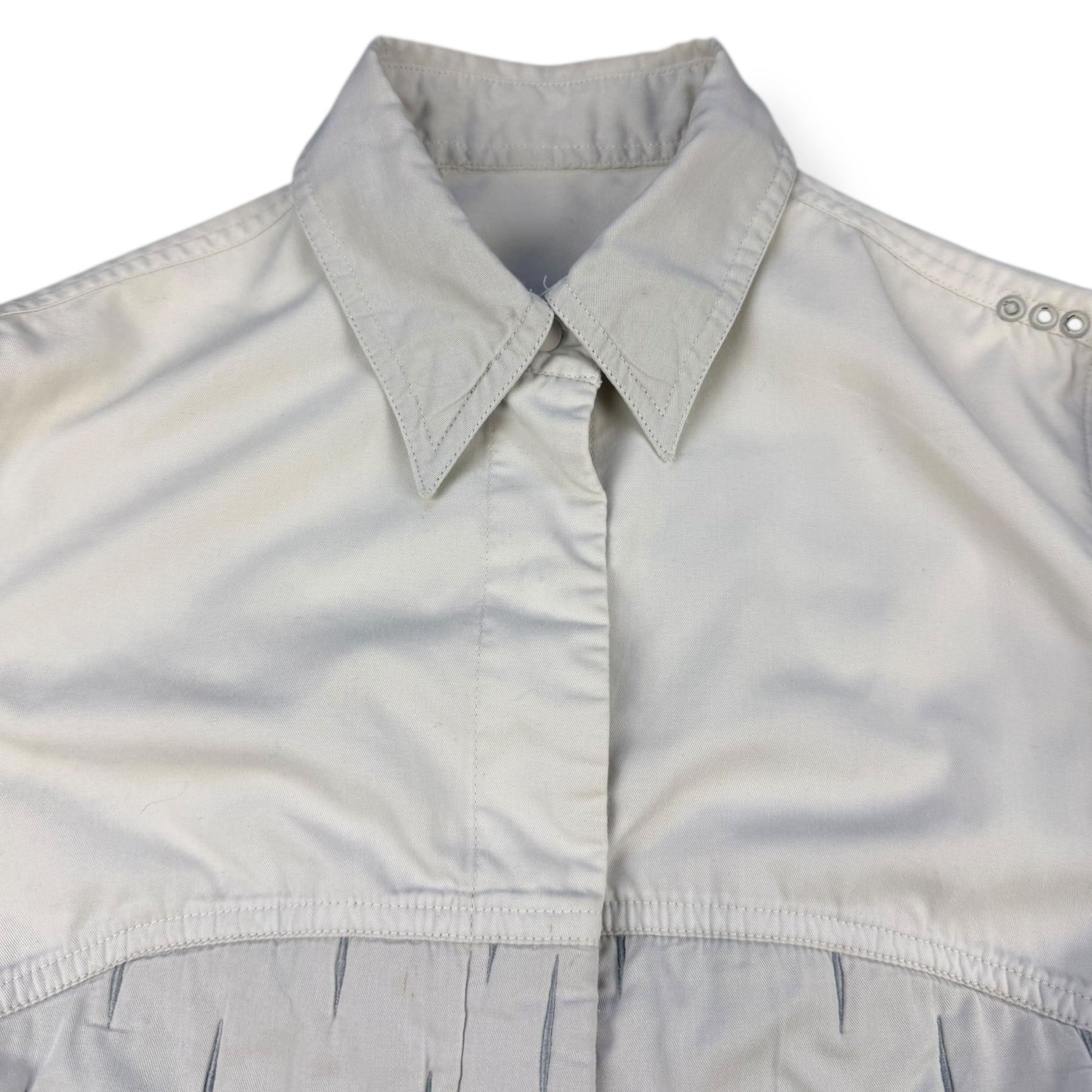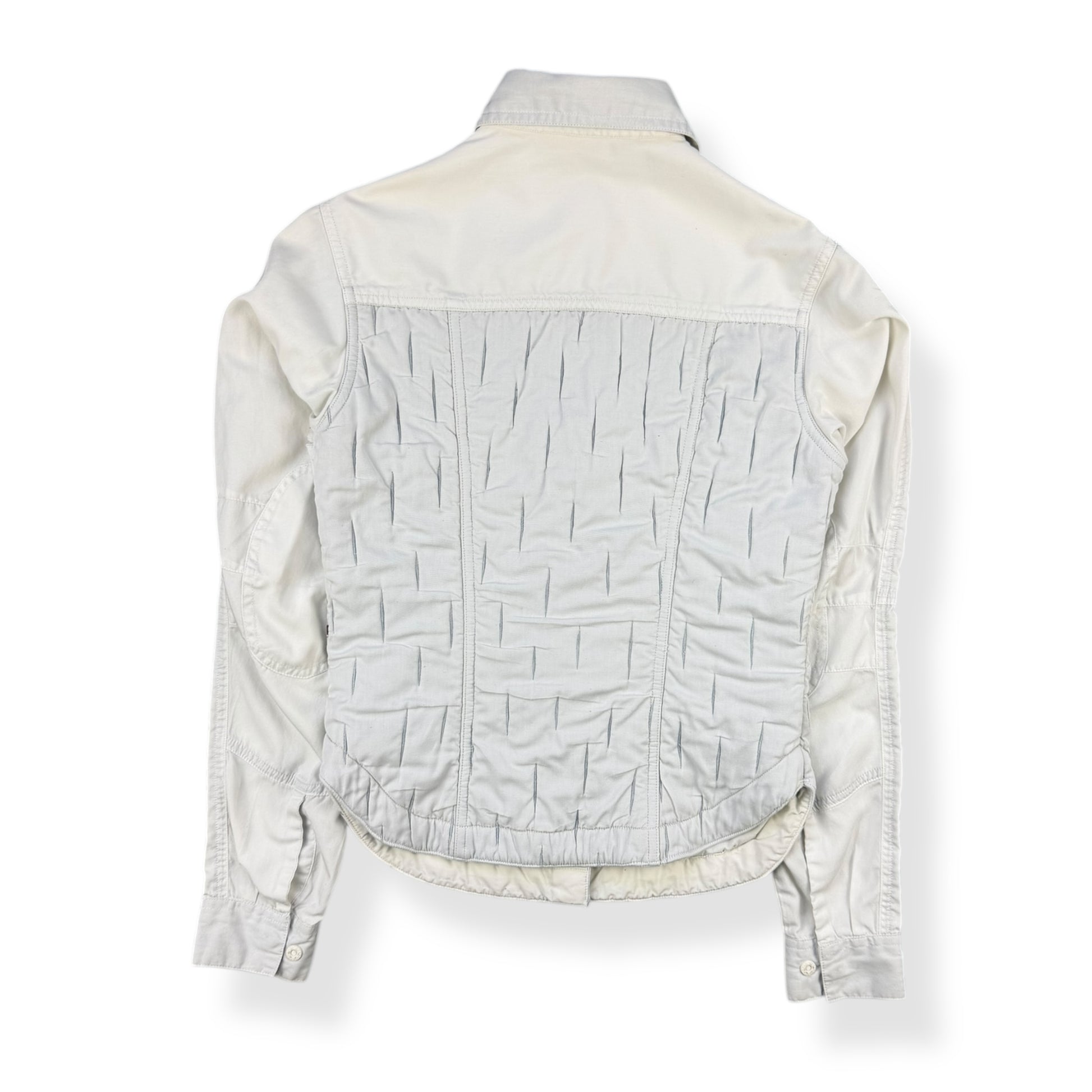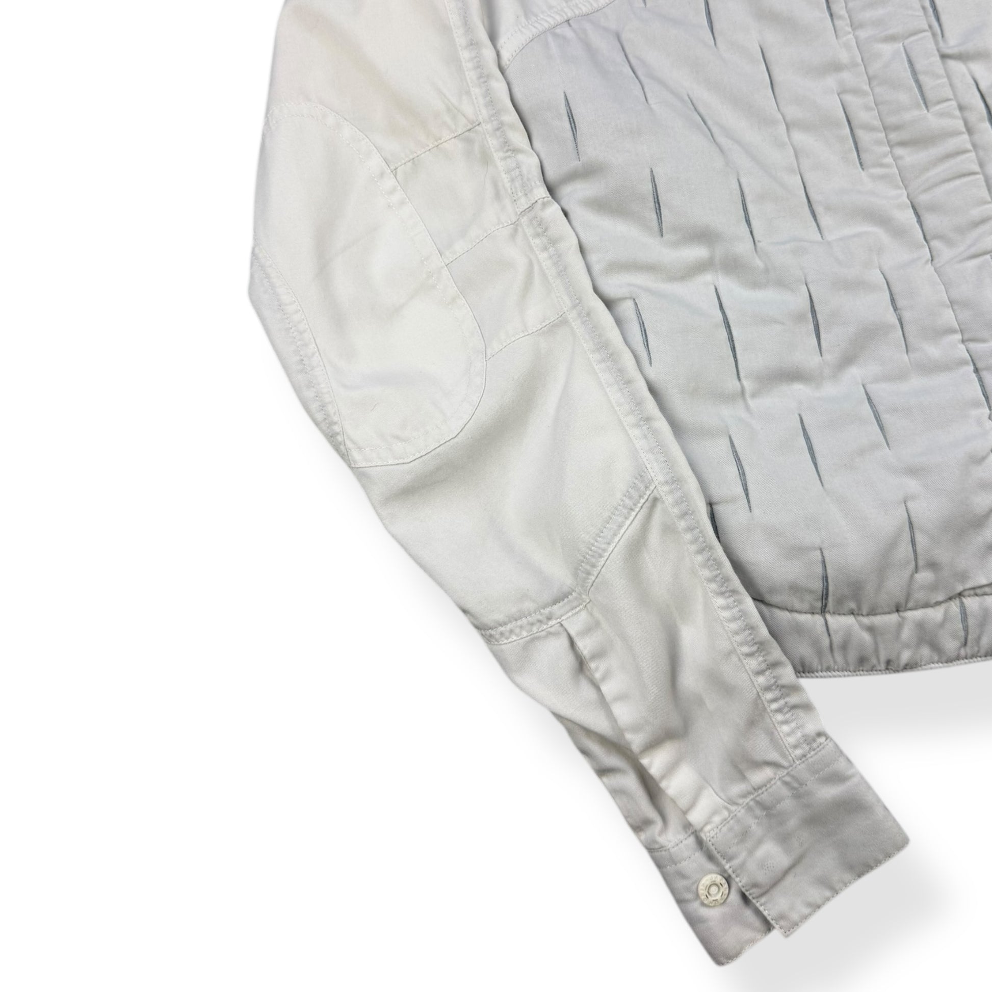 Thin white cotton, with a padded grey lower section. This padded section has a unique 3D rain strait style pattern, with vertical slits to the fabric. Elbows are darted & slightly reinforced with a double layer of fabric. The cuffs & main body opening are opened/closed with small white poppers.