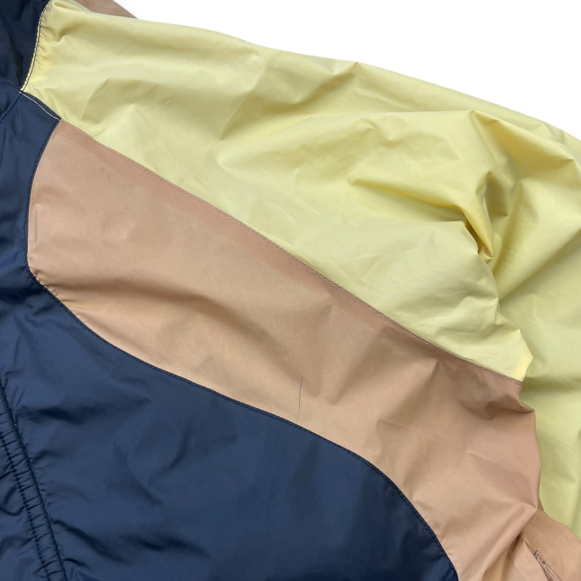 Curved, colour blocked panels of navy, orange & yellow. Super lightweight, nylon exterior with grey mesh interior, elasticated waist hem & velcro cuffs.