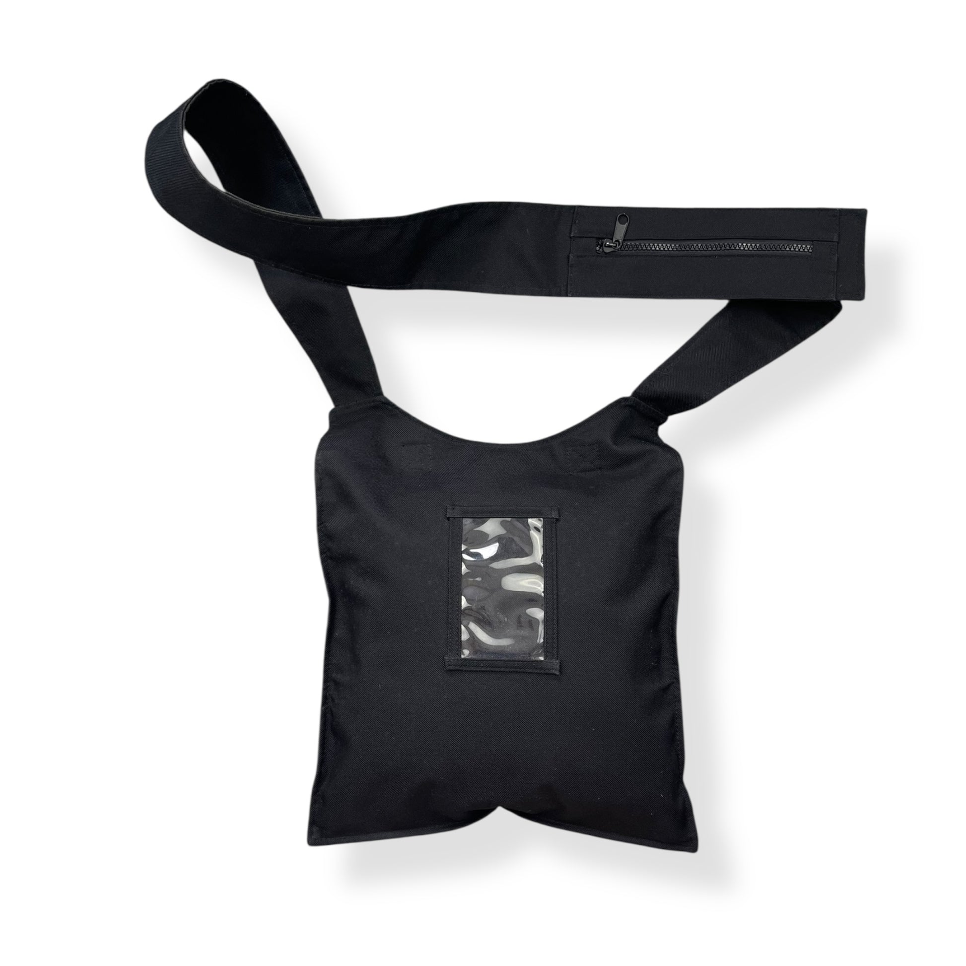 Reminiscent of the Vexed Generation record bag collab. Velcro pockets on the front as well as a main zipped compartment, stash zipped pocket on the shoulder strap, transparent plastic wallet on the back & durable exterior fabric.